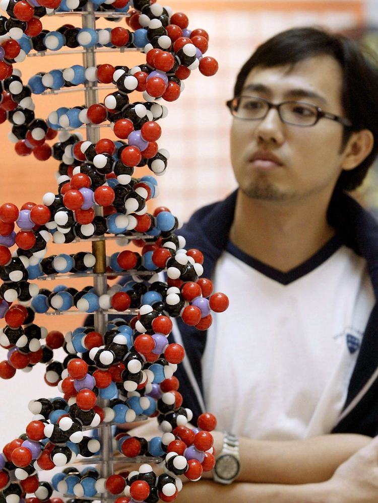 Statt zu experimentieren, hatten die beiden Experten Forschungsergebnisse anderer Wissenschaftler zusammengefügt. Bekannt war: Das Erbgut enthält jeweils gleich viele Teile der Basen Adenin (A) und Thymin (T) sowie Guanin (G) und Cytosin (C). Crick und Watson fanden heraus, dass A und T sowie G und C sich jeweils zu einer Art Leitersprosse miteinander verbinden und die gewundenen Ketten aus Phosphat und Zucker die Sprossen zusammenhalten. Mit Hilfe von Enzymen kann sich die Struktur selbst verdoppeln.
