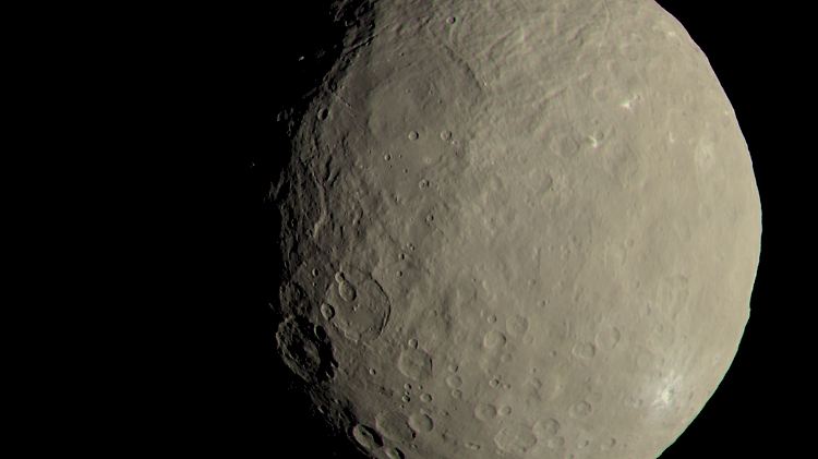 Die Wissenschaftler der Nasa veröffentlichten auch ein Bild, das zeigen soll, wie sich Ceres dem menschlichen Auge darbieten würde. Dafür arbeiteten sie mit dem Deutschen Zentrum für Luft- und Raumfahrt in Berlin zusammen. Das Bild kombiniert aktuelle Aufnahmen mit älteren aus dem vergangenen Jahr und nutzt die verschiedenen Farbfilter der Kameras, die "Dawn" an Bord trägt. So entstand eine fast farbechte Aufnahme.