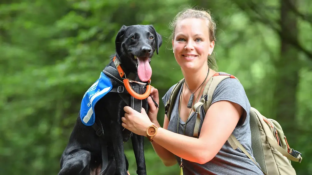 Die braunen Augen funkeln, die Nase ist dicht an den Boden gesenkt. Die knallorange Schleppleine wird gespannt, als Labrador-Hündin Maple Witterung aufnimmt und vorwärts sprintet. Schwanzwedelnd zeigt sie ihrer Trainerin Laura Hollerbach an, dass sie etwas gefunden hat.