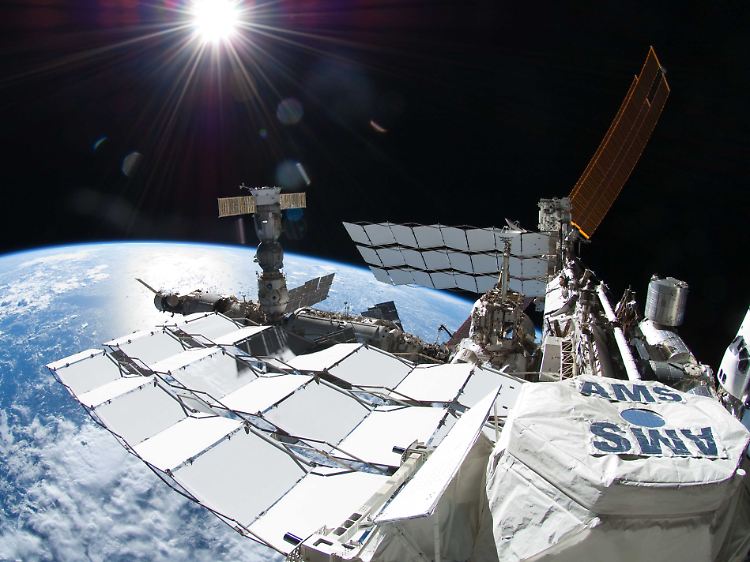 Die Internationale Raumstation ISS mit dem Detektor Alpha Magnetic Spectrometer (AMS-02).