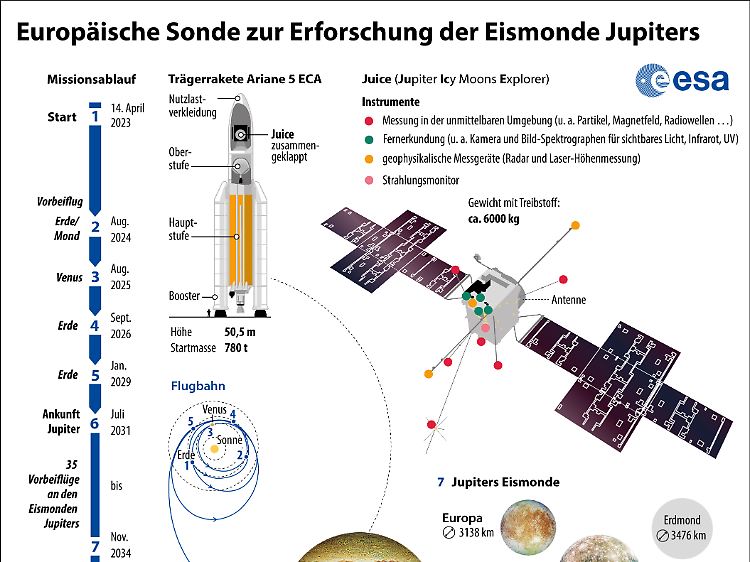 "Juice" soll nach einer jahrelangen Reise ab 2031 die Jupitermonde Europa, Kallisto und Ganymed genauer untersuchen. Fachleute vermuten unter den kilometerdicken Eispanzern dieser Monde Wasser – und damit mögliche Voraussetzungen für Leben. Die Mission am Gasriesen Jupiter soll von 2031 bis voraussichtlich 2035 dauern.