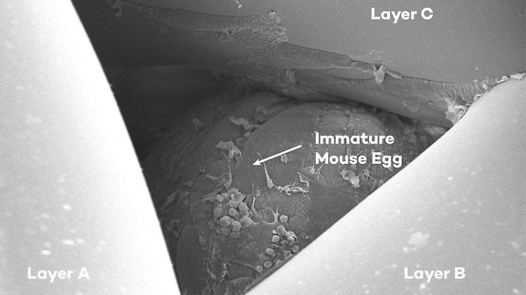 Mikroskop-Aufnahme eines unreifen Maus-Eies, umgeben von unterstützenden Zellen, in einem Gerüst mit mehreren Gelatine-Schichten.