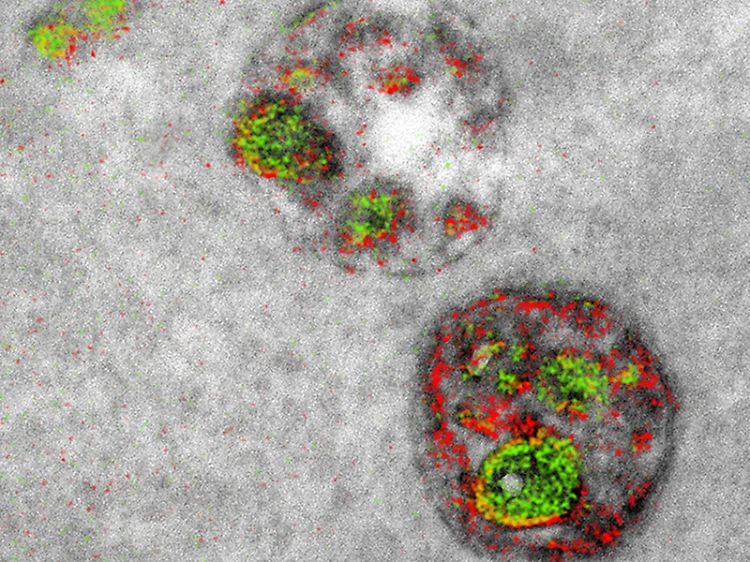 EELS-Aufnahmen machen die Cer- und Praseodym-Verteilungen sichtbar. Sie können unterschiedlich eingefärbt werden und über die Graustufenaufnahme gelegt werden. Das Cer-Bild hebt dann zum Beispiel die Membranen von Mitochondrien rot hervor, das Praseodym-Bild die Membranen von Zellkernen grün.