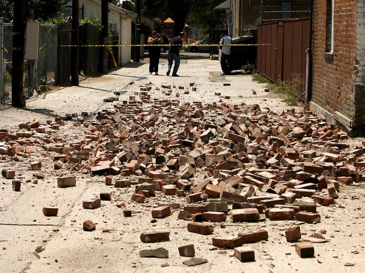 Steine einer umgestürzten Mauer nach dem Erdbeben im Sommer 2008 in Pomona, in der Nähe von Los Angeles.