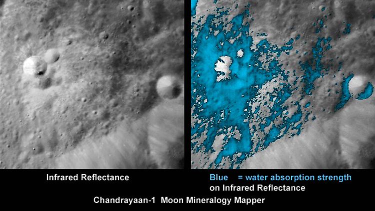 Entsprechende Nachweise waren den Forschern von der indischen Raumsonde Chandrayaan-1 während einer Mission im Jahr 2008 festgehalten worden. Ein Abgleich mit Daten des Mond-Erforschungsinstruments M3 der US-Raumfahrtbehörde Nasa habe drei chemische Signaturen ergeben, "die definitiv beweisen, dass es gefrorenes Eis auf dem Mond gibt", erklärte die Nasa.