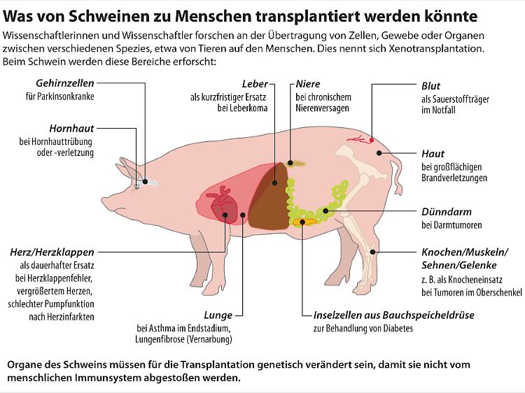 Die Zahl der Spender reicht also bei Weitem nicht, um den Bedarf an Organen zu decken. Deshalb richten sich Hoffnungen auf sogenannte Xenotransplantationen - also Transplantationen von Zellen, Geweben oder Organen von Tieren. Doch diese Technik birgt besondere Herausforderungen: Schon bei Transplantationen zwischen Menschen muss das Immunsystem des Empfängers unterdrückt werden, damit das Organ nicht abgestoßen wird.