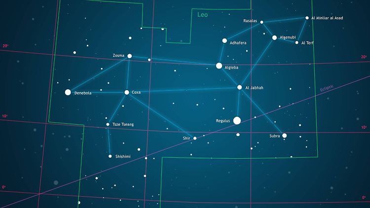 Den Südhimmel beherrscht der Löwe. Er ist das Leitsternbild des Frühlingshimmels. Ein großes Sterntrapez markiert den Rumpf dieses königlichen Tieres, ein kleines, aufgesetztes Trapez den Kopf mit der Mähne. Der Hauptstern des Löwen heißt Regulus, was so viel wie kleiner König bedeutet. An ihm zieht die Sonne jährlich am 23. August vorbei. Denn der Löwe gehört zu den 13 Tierkreissternbildern. Regulus ist eine bläuliche, heiße Sonne in 77 Lichtjahren Entfernung.