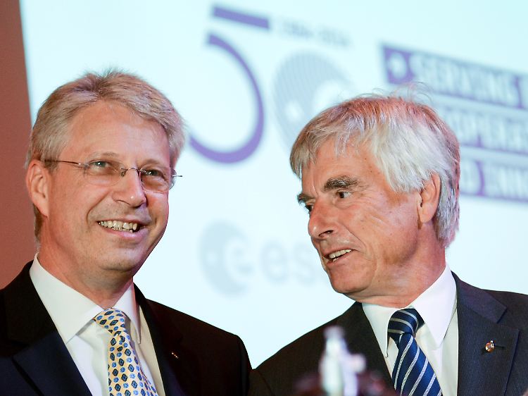 Esa-Direktor Thomas Reiter (l.) und Ulf Merbold, erster Esa-Astronaut. beim Festakt zum 50-jährigen Bestehen der europäischen Raumfahrt.