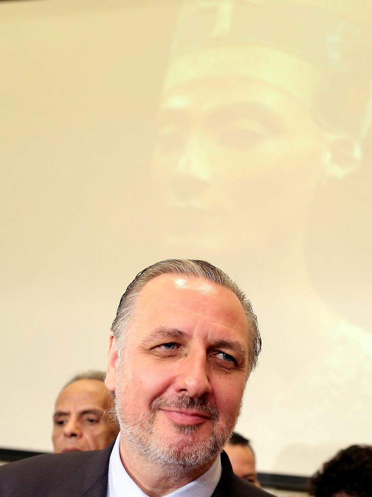 Der Ägyptologe Nicholas Reeves bei der Pressekonferenz in Kairo, neben dem ägyptischen Antikenminister Mamduch Al-Damati (2.v.l.).