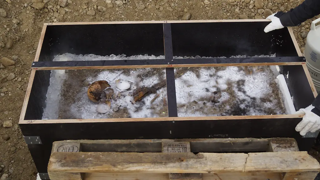 Fast ein Dreivierteljahr nach der Entdeckung eines rund 1300 Jahre alten Kindergrabs in Schwaben wird die tiefgefrorene Ruhestätte aufgetaut. Die Experten des Bayerischen Landesamtes für Denkmalpflege hatten das Grab im Oktober 2021 in einem Neubaugebiet in Tussenhausen im Landkreis Unterallgäu mit einer neuartigen Schockfrost-Technik geborgen.