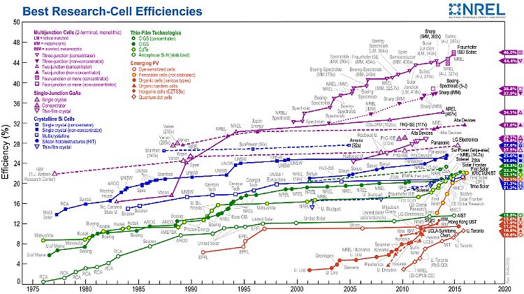 Das Wettrennen um den Wirkungsgrad dokumentiert das National Renewable Energy Laboratory (NREL) aus den USA.