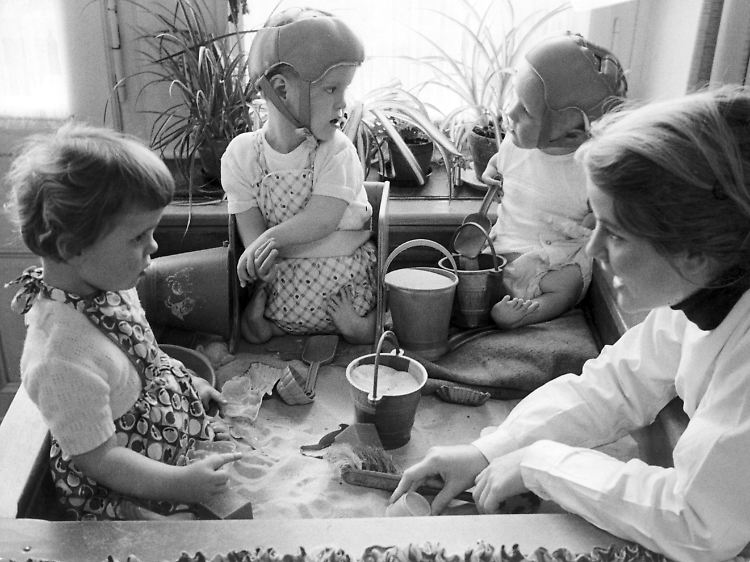 Contergan-geschädigte Kinder spielen mit einer Betreuerin. (Aufnahme aus den 1960er-Jahren).