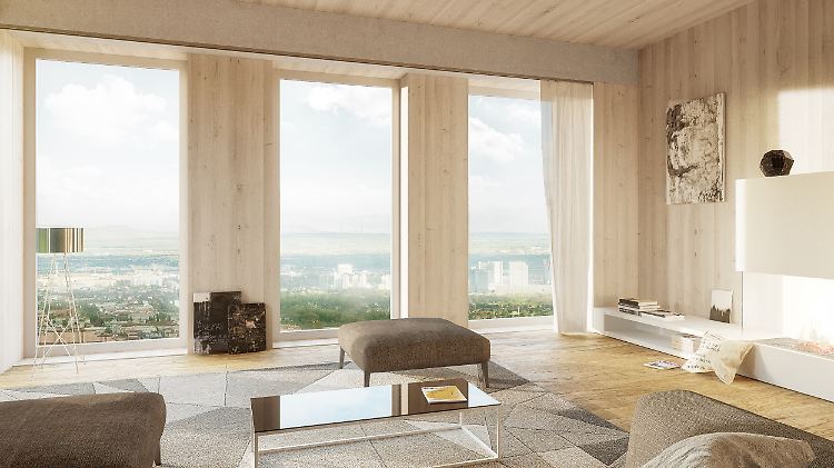 Maserung dominiert: So sollen die Appartements im Wiener Holzhochhaus mal von innen aussehen.