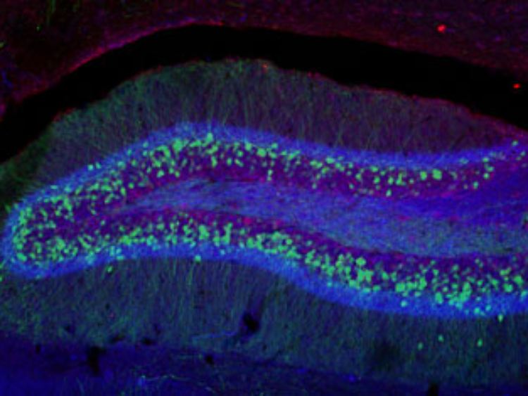 Erregende Nervenzellen (grün) und Einflussbereiche hemmender Synapsen (blau, rot) im Hippokampus, einer Hirnregion, deren Funktion bei vielen Epilepsieformen gestört ist.