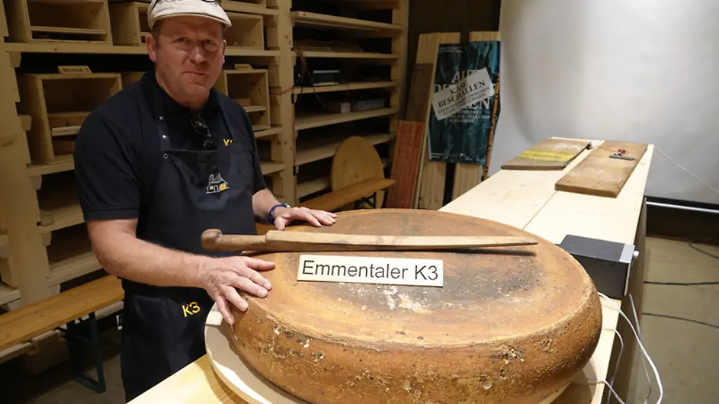 Beat Wampfler ist seine Liebe zum Emmentaler Käse fast anzusehen. Der 54-Jährige streicht in seinem Käselager vorsichtig über die rund 100 Kilogramm schweren Käselaibe. Zwischen den Regalen steht in dem großen Vorderraum ein dicker Holztisch für Käseverkostung, dort reicht Wampfler zünftigen Wein, frisches Brot und Obst. "Mein Lieblingskäse ist der Emmentaler" sagt er überzeugt. Sein Großvater war Käser, sein Bruder ist Milchbauer, es muss bei ihm ein bisschen in der Wiege gelegen haben.