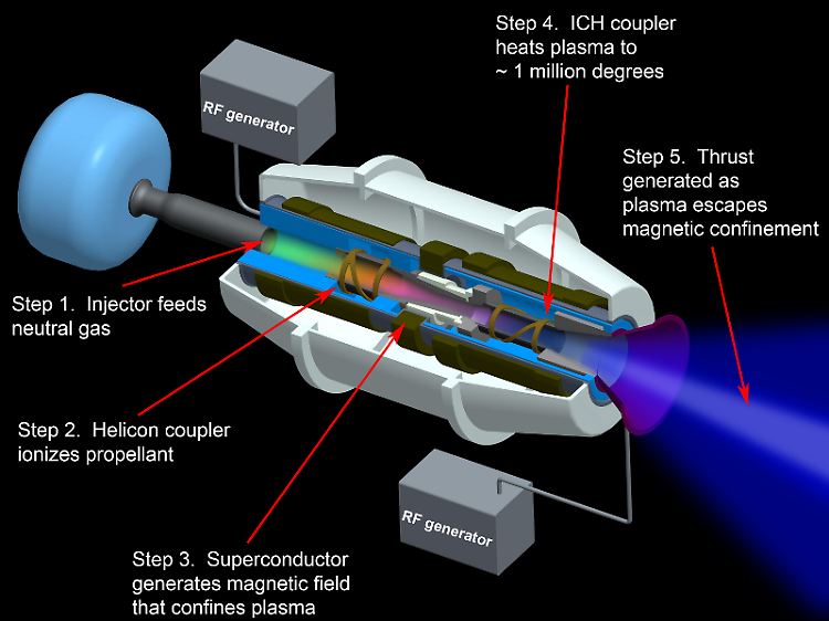 Es handelt sich dabei um eine Art magnetischen Plasmaantrieb. Seine Schubkraft schöpft er aus ionisiertem Gas, das mit Magnetfeldern weiter aufgeheizt wird. Der Vorteil: Er soll hohen Schub erzeugen oder alternativ ein Raumschiff über eine langen Zeitraum mit geringerem Schub beschleunigen können. Theoretisch sind auch hier Spitzengeschwindigkeiten von mehreren Hundertausend Stundenkilometern möglich.