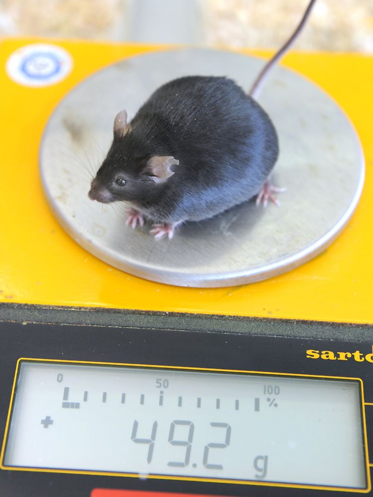49,2 Gramm: Eine dicke Maus mit einem Gewicht wird bei einer wissenschaftlichen Untersuchung zur Fettleibigkeit gewogen.