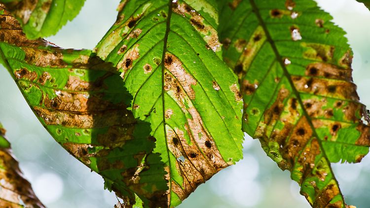 Seit zwei Jahrzehnten ernähren die Kastanien Deutschlands einen kleinen aggressiven Schmetterling. Durch die Kastanienminiermotte verlieren die Bäume ihre Blätter bereits im Spätsommer. Die typischen braunen Stellen auf den grünen Kastanienblättern zeigen den Befall an. Die Motte hat an diesen Stellen wie ein Minenarbeiter Gänge zwischen oberer und unterer Blatthaut ins Gewebe gefressen.