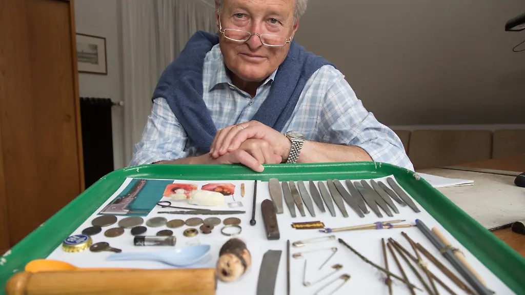 "Die vielen Löffelstiele hat ein Mann verschluckt. Er war Insasse einer Justizvollzugsanstalt bei Bonn und erhoffte sich dadurch Abwechslung vom Gefängnis-Alltag." Miederer zeigt auf eine ganze Reihe von Metall-Stielen. Den eigentlichen Löffel hatte der "arme Schlucker", wie der 74-jährige Mediziner im Ruhestand ihn lächelnd nennt, abgebrochen, um den gut zehn Zentimeter langen Rest vom Besteck besser durch die Speiseröhre zu bekommen. "Das brachte mindestens zwei Wochen Krankenhaus. Er kam aus dem Gefängnis heraus und konnte zudem die Pflege der Krankenschwestern genießen."