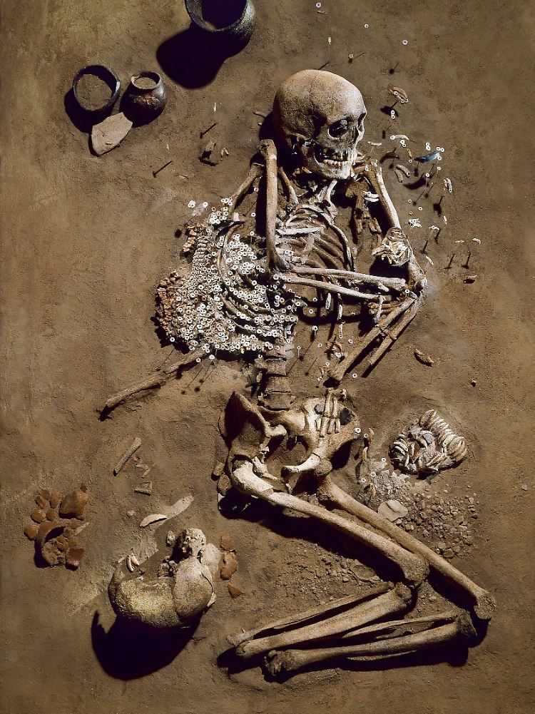 Die Verstorbene gehörte zur Bandkeramischen Kultur, einer bäuerlichen Gruppe in der Jungsteinzeit. Sie wurde mit hunderten von Pailletten aus Muschelschalen beigesetzt.