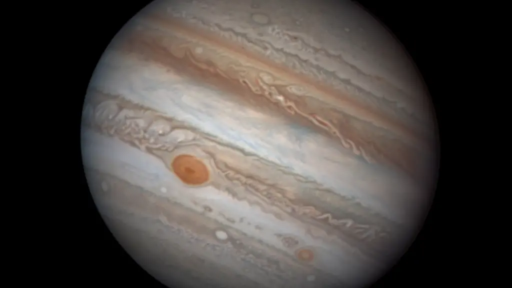 Der Planet dreht sich sehr schnell um seine Achse. Ein Jupitertag dauert nur knapp zehn Stunden. Wegen seiner raschen Rotation ist der Riesenplanet stark abgeplattet. In der dichten Atmosphäre, die hauptsächlich aus Wasserstoff und Helium besteht, sind parallele Wolkenstreifen und Bänder zu erkennen. Auch Methan, Ammoniak und sonstige Kohlenwasserstoffe wurden in der Jupiterluft nachgewiesen, ebenso Phosphin. Auf dem Planeten tobt seit Jahrhunderten ein gewaltiger Sturm. Der als "Großer Roter Fleck" bekannte Sturmwirbel ist auf Aufnahmen der Planetenoberfläche deutlich zu sehen. Zudem wurde ein deutlich kleinerer und jüngerer Sturm ausgemacht: der "Rote Fleck Junior".