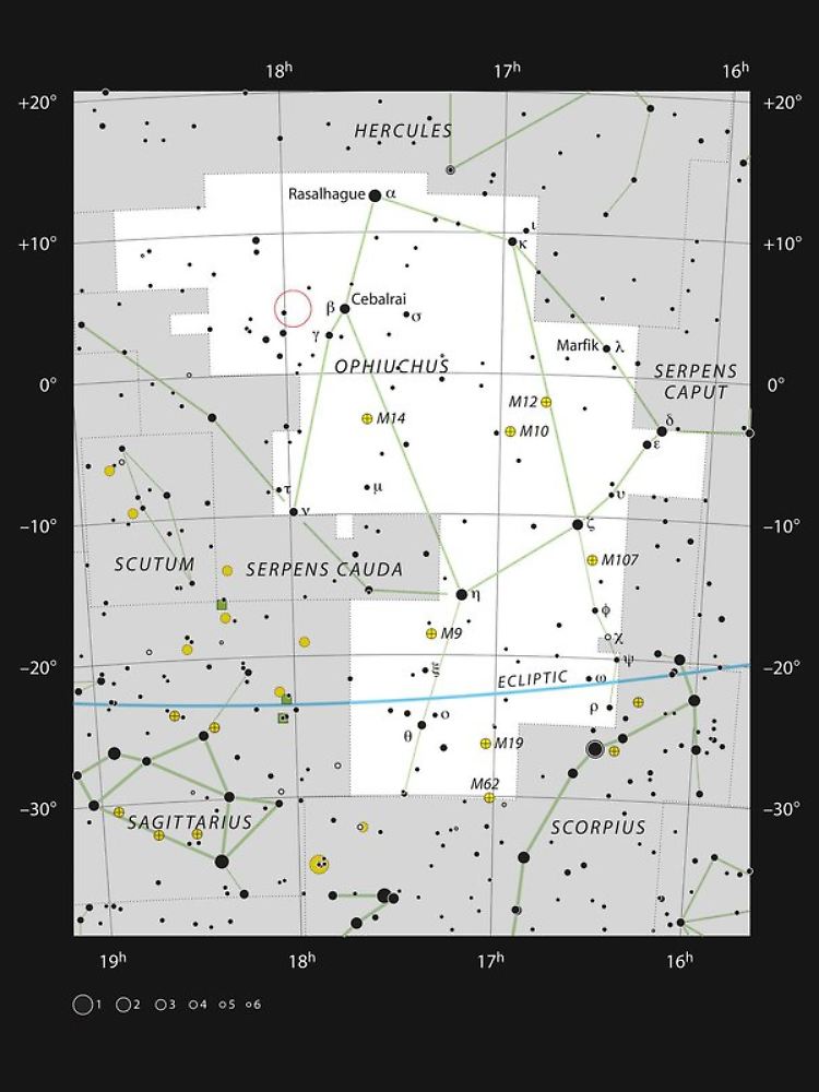 Sternbild von Ophiuchus, der den Himmelsäquator überspannt. Das Diagramm zeigt die Position von Barnards Stern und markiert die meisten Sterne, die mit bloßem Auge in einer klaren, dunklen Nacht sichtbar sind.