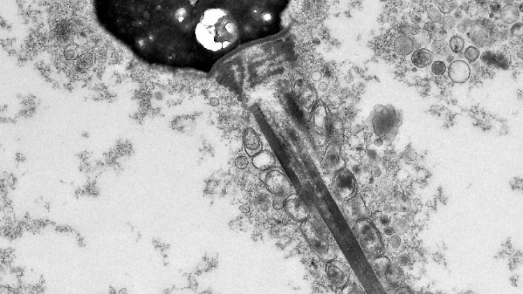 Die elektronmikroskopische Aufnahme zeigt ein Spermium mit angelagertem Amyloid.