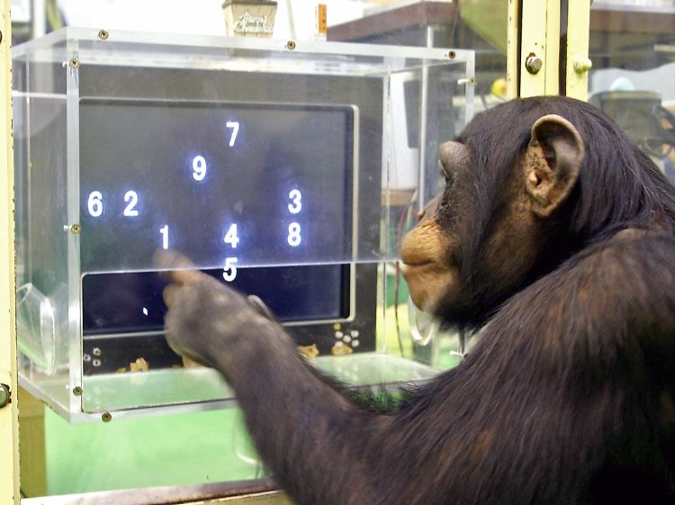 Mit seinem langen, braunbehaarten Finger tippt Ayumu immer wieder auf einen Computerbildschirm. Die japanischen Schriftzeichen für "Grau" und "Gelb" kann der Schimpanse ohne Probleme den entsprechenden Farben zuordnen. Auch die Zahlen von 1 bis 19 nacheinander anzuklicken, ist kein Problem für Ayumu, der im Jahr 2000 geboren wurde und in einem japanischen Forschungsgehege lebt. Die Ziffern 1 bis 9 bringt er sogar dann in die richtige Reihenfolge, wenn die Zahlen nach dem Zufallsprinzip auf dem Bildschirm verteilt sind und von einem grauen Kästchen verdeckt werden. Ayumu tippt auf die 1 - und schon geht es los.
