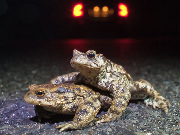 Denn die Kröten wandern immer auf dem schnellsten Weg zum Wasser - auch wenn dieser von einer Straße gekreuzt wird. Dass ihnen ebenso wie Fröschen und Molchen selbst dann Lebensgefahr droht, wenn die Straßen nur wenig befahren sind, zeigt eine Studie. Danach liegt die Überlebenswahrscheinlichkeit der Tiere auf einer Straße, auf der nur 15 Autos pro Stunde fahren, bei lediglich 15 Prozent.