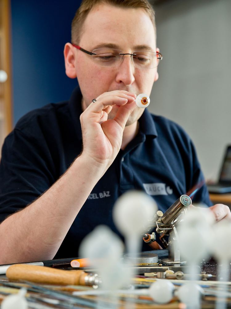 Schätzungen der Deutschen Ocularistischen Gesellschaft (DOG) zufolge haben rund 20.000 bis 30.000 Menschen in Deutschland ein Glasauge. "In den meisten Fällen, wenn es nicht gerade ein schwerer Unfall war, fällt es nach der Versorgung gar nicht groß auf", schildert Marcel Bäz, einer von Rauchs Mitarbeitern und Ocularist in der fünften Generation. Gemeinsam mit seinem Bruder Manuel sitzt er gerade an einem speziellen Arbeitstisch und fertigt mit Hilfe von Bunsenbrennern, verschiedenen Glassorten und Farbstäben die Rohlinge an, aus denen später die individuellen Kunstaugen geformt werden.