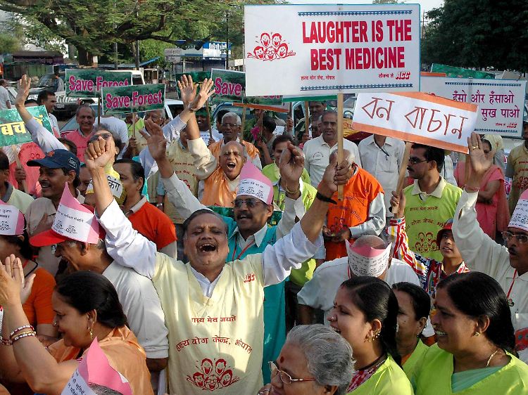 Lachende Teilnehmer eines Lach-Treffs: Dabei geht es nicht um Humor, sondern um eine Yoga-Variante. Hinter dem Lach-Yoga steckt mehr als ein einfaches "Abschalten".