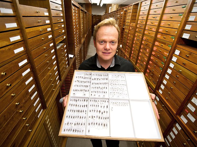 Auf anderen Feldern ist der Nutzen von Schlupf-, Erz- und Wegwespen längst bekannt. Die Tiere werden in Deutschland etwa zur Bekämpfung von Maiszünslern und Kornkäfern eingesetzt. Auch gegen Blattläuse schwärmen die Hautflügler aus. Krogmann versucht, möglichst viele Arten zu finden und einzuordnen. Mit bloßem Auge kommt er kaum weiter. Die kleinsten schwarzen Punkte in seinem Schaukasten sind selbst mit Lupe kaum voneinander zu unterscheiden.
