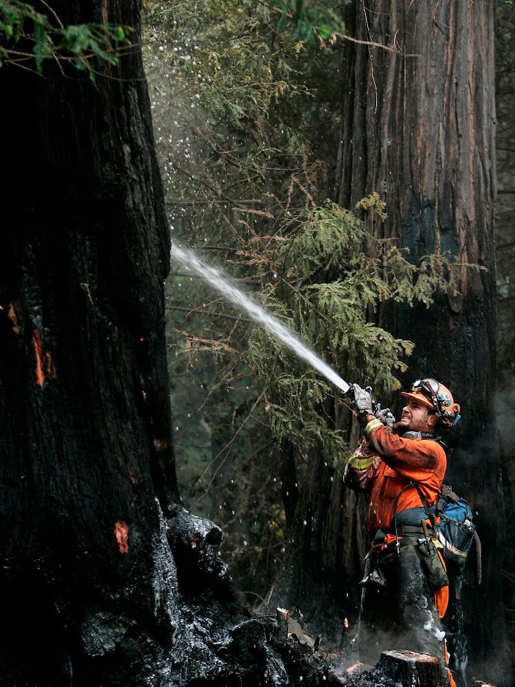 Ein Feuerwehrmann versucht in Big Sur (Kalifornien), mit Wasser aus einem Feuerwehrschlauch einen Mammutbaum zu retten.