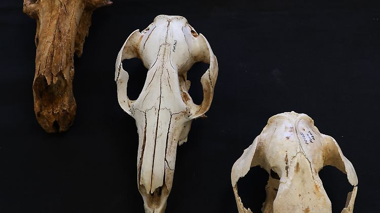 Känguru-Schädel der Flinders University, die für die Studie untersucht werden: (v.l.n.r.) Protemnodon, Macropus, Procoptodon.