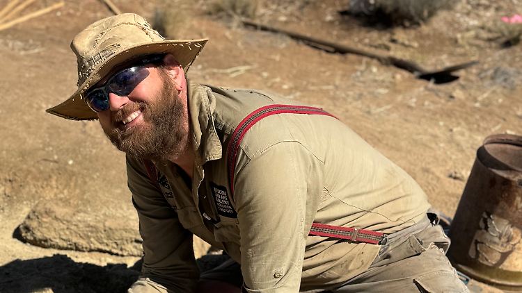 Der Paläontologe Sam Arman gräbt im Alcoota Scientific Reserve im Northern Territory Fossilien von Megafauna aus.