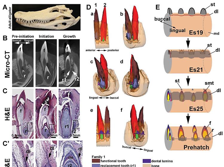 Verliert der Alligator eines seiner 80 Kauwerkzeuge, rutscht Einheit um Einheit nach: Der Ersatzzahn entwickelt sich zum ausgewachsenen Zahn, die Zahnleiste wird zum neuen Ersatzzahn und vom Ersatzzahn spaltet sich eine Gewebsschicht ab, die zur neuen Zahnleiste wird.