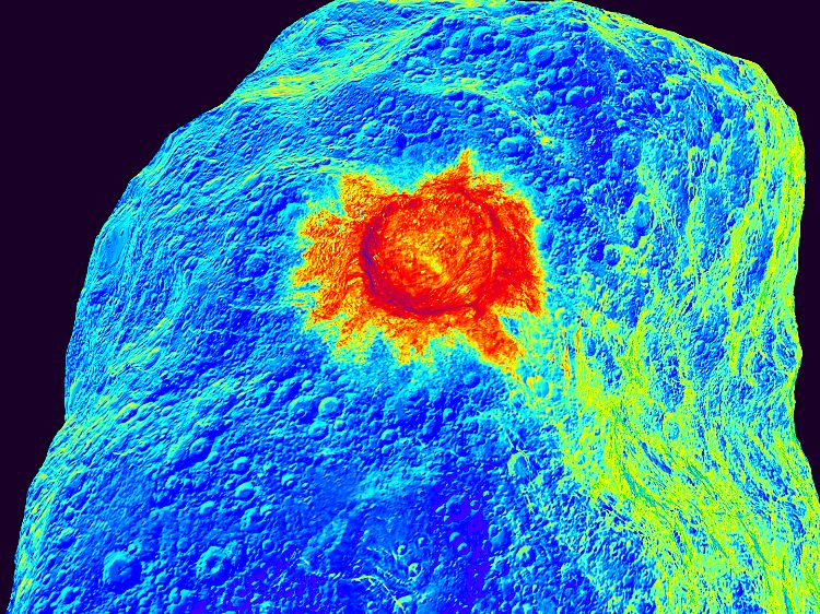 Dieses Wärmebild zeigt einen Krater, wie er durch den Einschlag der DART-Sonde auf dem Asteroiden Dydimoon entstehen könnte.