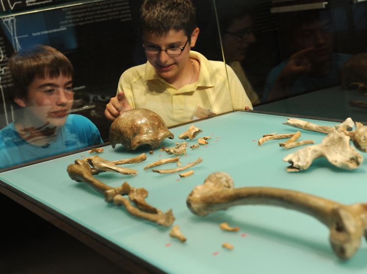 Zwei Vierzehnjährige bestaunen die Überreste eines Neandertalers im Landesmuseum Bonn.