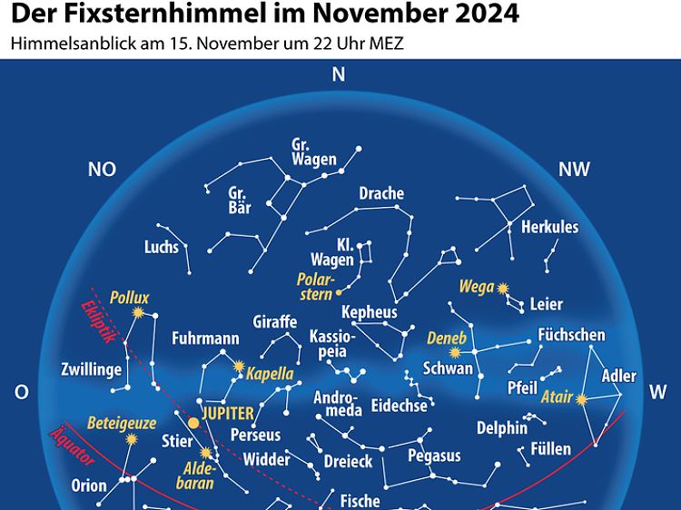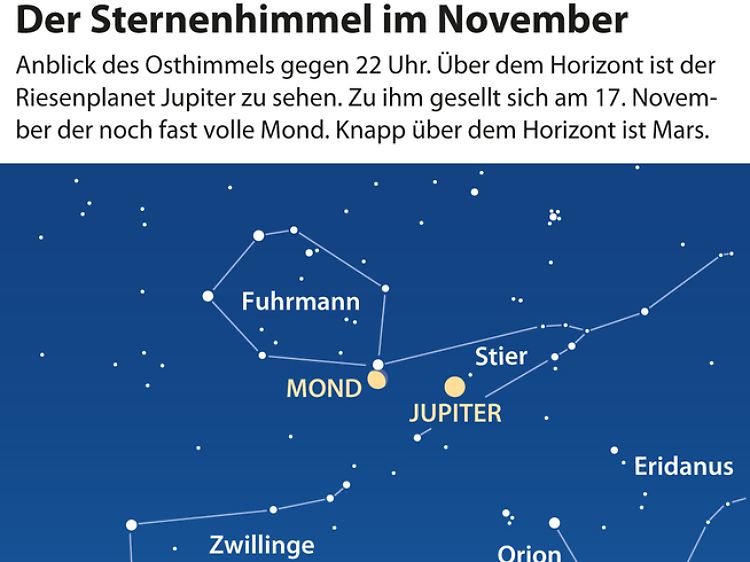 Dominierendes Gestirn des Nachthimmels ist zweifellos Jupiter. Der Riesenplanet steht kurz vor seiner Opposition zur Sonne. Er beherrscht den Nachthimmel als auffällig heller Lichtpunkt. Um Mitternacht sieht man ihn hoch im Süden im Sternbild Stier nahe dem offenen Sternhaufen der Hyaden, auch als Regengestirn bekannt.