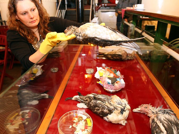 Greenpeace protestiert eindrücklich mit an Plastikteilen verstorbenen Vögeln gegen den Müll in den Meeren.