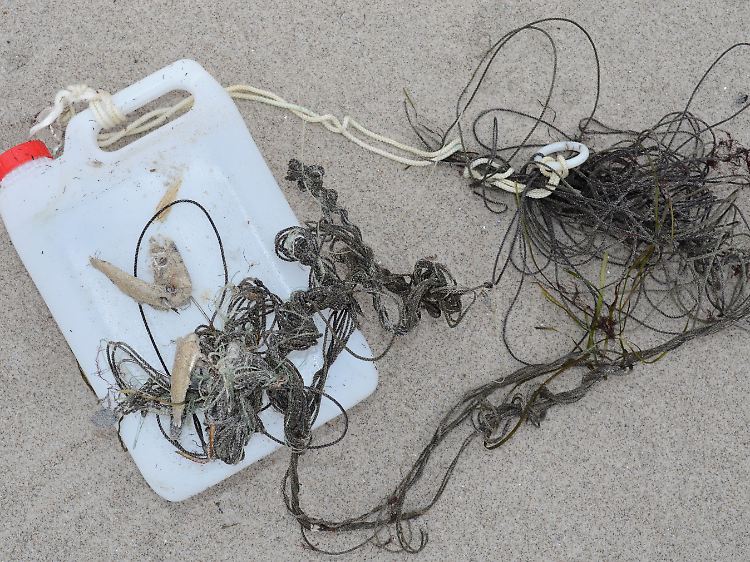 Plastikbehälter mit Angelschnur am Strand: Besonders Plastikmüll aus der Schifffahrt, Tourismus und Fischerei führt zur Verschmutzung von Wasser und Badestränden an der Ostsee.