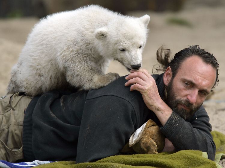 Der vier Monate alte Knut klettert auf seinen Pfleger Thomas Dörflein - auch der war zum Publikumsliebling geworden. Dörflein starb im September 2008.