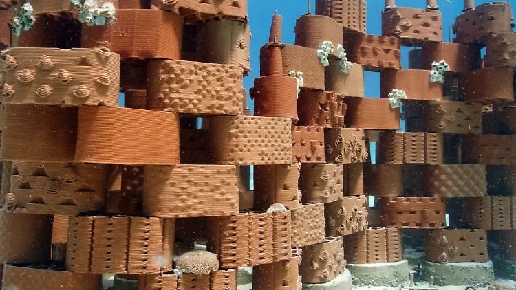 Wir stellen unsere Module mit Lehm-3D-Druckern her. Die sind etwas größer als die kleineren für Plastik-Filament, die mittlerweile viele kennen. Die Module sind etwa 40 Zentimeter lang und ein paar Zentimeter hoch. Sie sehen aus wie ein größerer Lego-Stein, nur spezieller geformt und hohl, damit sie sich für Korallen und kleine Fische eignen. Momentan haben wir Hersteller in der Schweiz und in Mexiko. Wir wollen das auch in Indien hinbekommen, um Südostasien besser versorgen zu können.