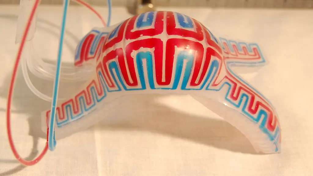 Flexibel wie Gummi macht den Roboter ein Netz aus kleinen Kanälen, die je nach Bewegung mit Luft befüllt werden oder leerbleiben. Ein zweites Netz aus Kanälen verläuft oberflächlich und füllt sich je nach Bedarf mit Farbe sowie kalten oder warmen Flüssigkeiten.