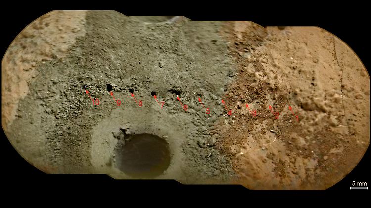 Die Probe wurde durch ein Loch entnommen, das gerade einmal 1,6 Zentimeter Durchmesser hat und 6,4 Zentimeter tief ist. Anfang Februar hatte "Curiosity" erstmals den Roten Planeten angebohrt, um eine Gesteinsprobe zur Analyse zu entnehmen. Um auf jede mögliche Gesteinsart auf dem Mars vorbereitet zu sein, hatte die US-Weltraumbehörde acht Bohrer entwickelt, mit denen mehr als 1200 Löcher in 20 Gesteinsarten der Erde gebohrt wurden.