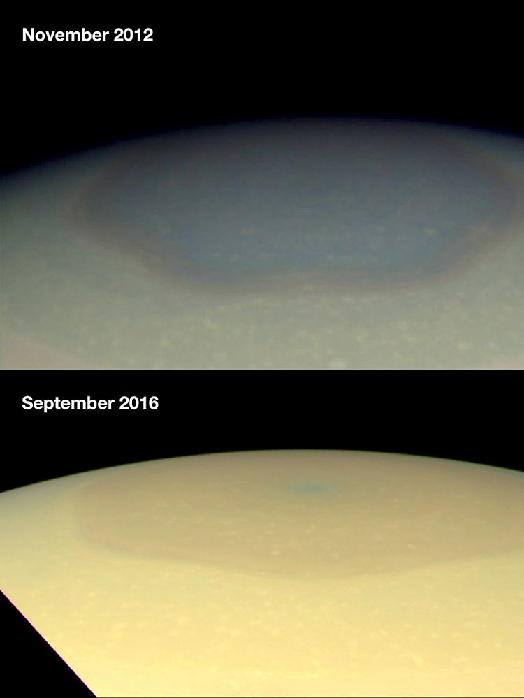 Nach der Tag-Nacht-Gleiche im August 2009 erhöhte sich nun möglicherweise langsam der Anteil der Aerosole innerhalb des Hexagons wieder, was zu seinem derzeit dunstig-goldenen Erscheinungsbild geführt haben könnte. Für die Wissenschaftler ist das im Zusammenspiel mit anderen Atmosphäre-Veränderungen auf dem Saturn die plausibelste Erklärung der Beobachtungen.