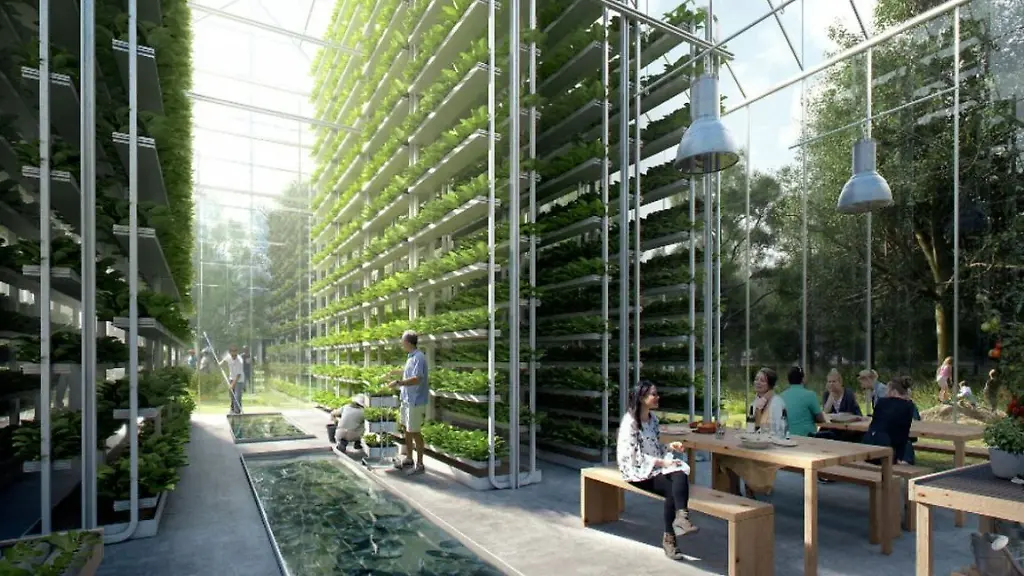 Das Essen wächst vor der eigenen Haustür in eigenen Gewächshäusern. Es soll saisonal bewirtschaftete Gärten geben, Gewächshäuser mit vertikalem Anbau, Tierhaltung sowie Aquaponiks. Bei Letzterem handelt es sich um eine Fischzucht, die mit Pflanzenanbau in Hydrokultur kombiniert wird, indem die Exkremente der Fische als Dünger für die Pflanzen genutzt werden. Gefüttert werden die Fische mit Fliegenlarven.
