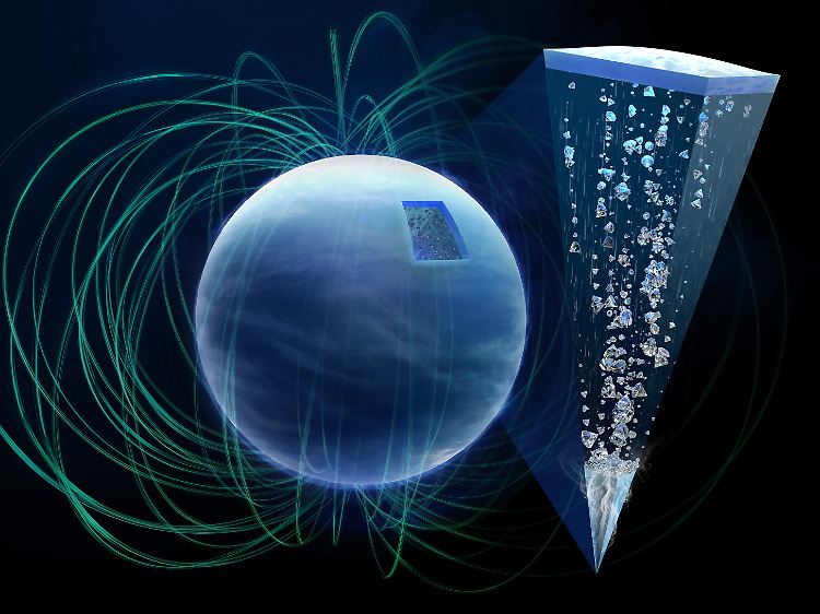 Phänomen des Diamantenregens im Inneren des Planeten, bei dem Diamanten durch das umgebende Eis nach unten wandern: Je tiefer sie in das Innere vordringen, desto höher werden Druck und Temperatur. Selbst in den sehr heißen Regionen bleibt das Eis aufgrund des extrem hohen Drucks erhalten.