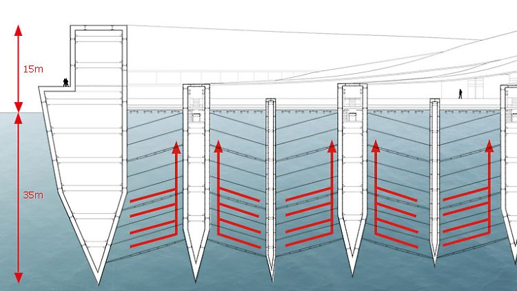 Querschnitt durch die riesige Konstruktion der Aachener Architektin - im Inneren soll das Meereswasser beruhigt werden, was dem Plastik Auftrieb verschafft.