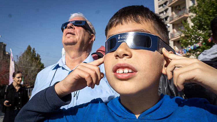 Europaweit zu sehen: Ein Kind mit Sonnenbrille beobachtet in Pristina im Kosovo die partielle Sonnenfinsternis.
